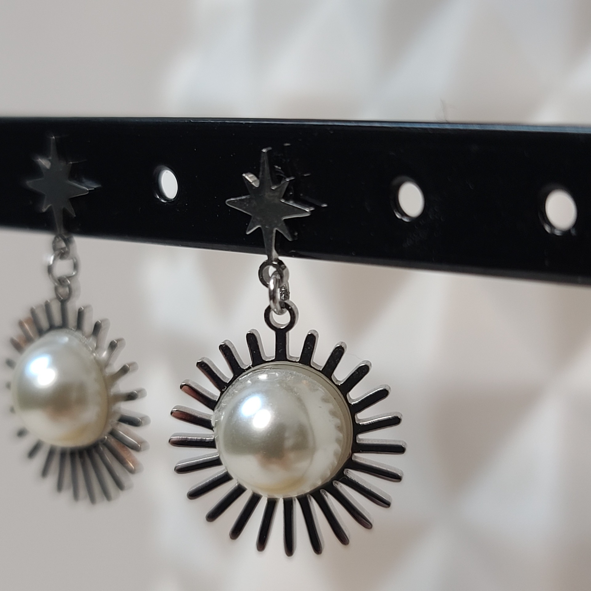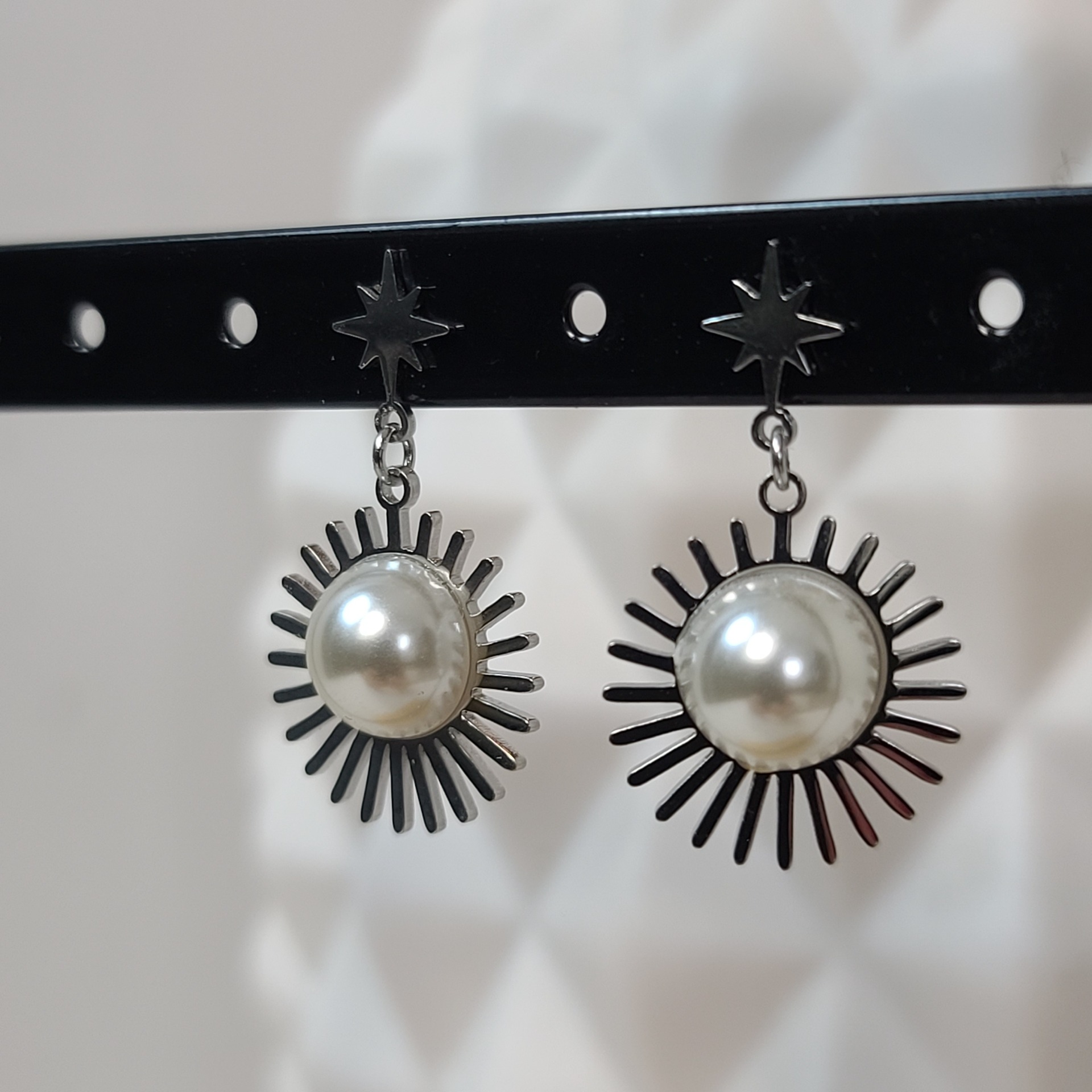 ☆ Boucles d'oreilles ☆ Pendantes ☆ Argentées et nacrées ☆ Étoile argentée en haut ☆ Perle nacrée sertie ☆ Rayons argentés ☆ Longueur : 3,5 cm☆ Acier inoxydable